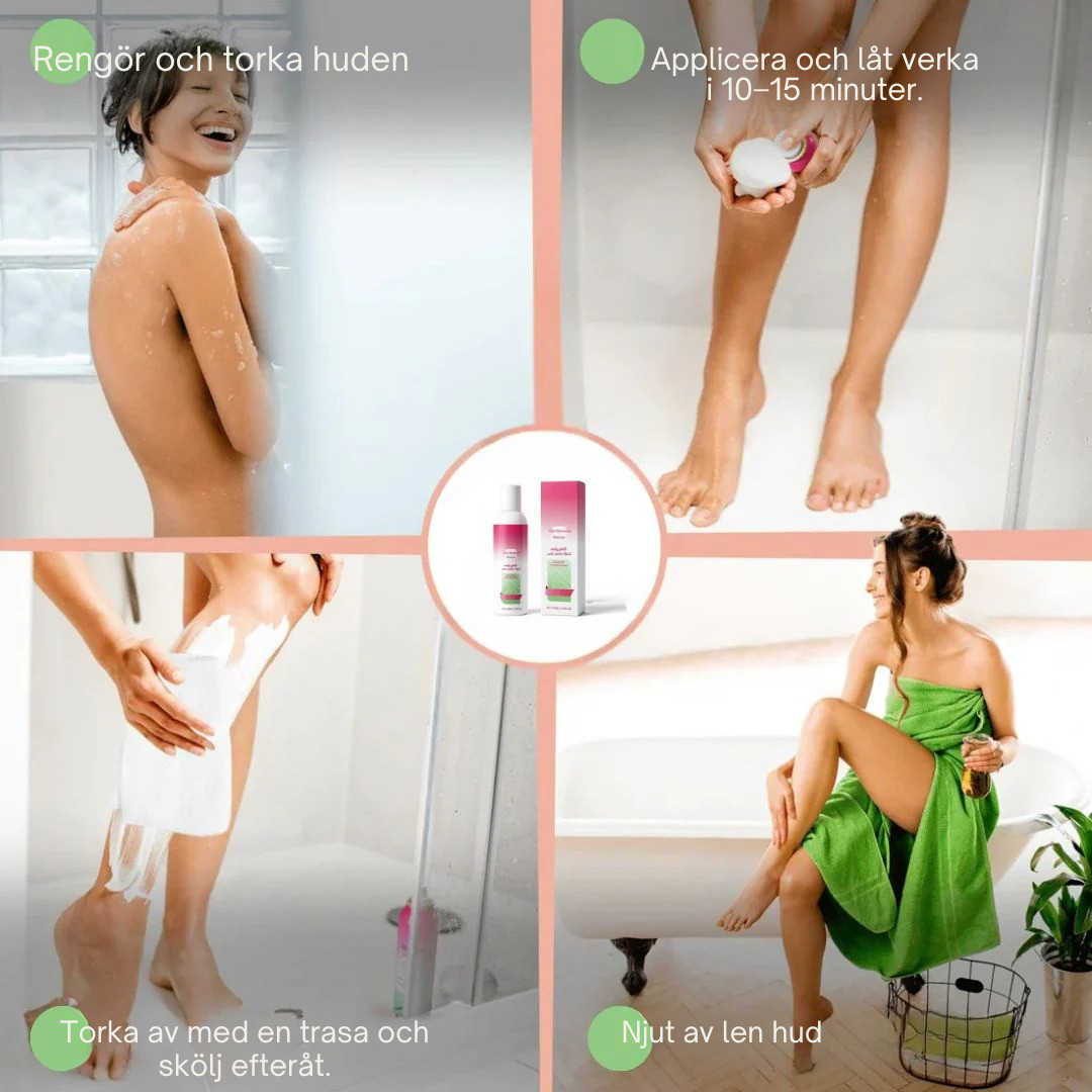 Vår avancerade lösning tar bort oönskat hår utan smärta samtidigt som den vårdar huden och lämnar den återfuktad och frisk. Din hårfria hud blir mjuk, lugn och uppfriskad.