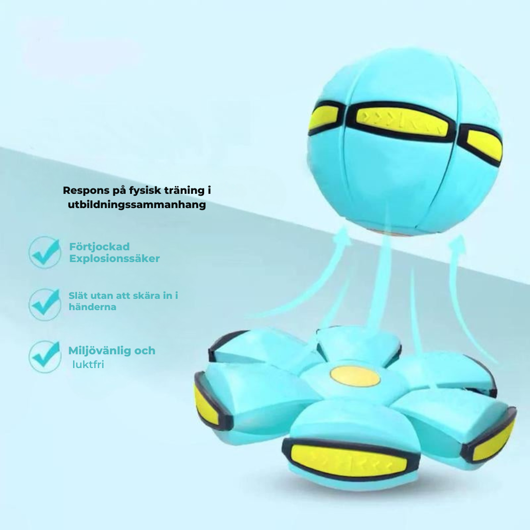 Två former i en - Med ett enda tryck förvandlas bollen från en klassisk studsboll till en platt ”flygande skiva” och studsar tillbaka till sin ursprungliga form. Perfekt för att främja kreativitet och utveckla barns motoriska färdigheter.